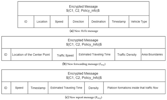 The new messages for the proposed secure protocol are illustrated in Figure 5, with modifications to their contents. Figure 5a illustrates the new fields of the message. Figure 5b illustrates the fields of the new message, and Figure 5c illustrates the fields of the new message. As we can infer from the figures, the new versions of , , and contain the same fields and contents as the messages used in the original insecure protocol. However, the contents of the new message are encrypted, and extra fields are appended to the new messages. These extra fields combine the ciphertexts generated during the encryption process (i.e., C1 and C2) and the required access policy information (). The part of the encrypted message contains information about the access policy used during the encryption process. It specifies the attributes that the recipients must possess to decrypt the message successfully. The may be encoded in a format that can be easily processed by the recipient vehicles.