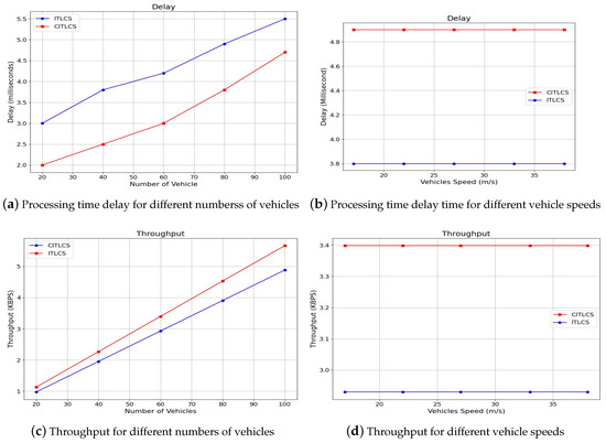 First, measuring the processing time delay for different numbers of vehicles and for different speed times is a key factor in evaluating the responsiveness of the CITLCS compared to the ITLCS. It mainly represents the required time for a message or command to traverse the system between a source and destination (i.e., V2V or V2I). The delay analysis encompassed scenarios with varying loads and network conditions to provide insights into the impact of security protocols on communication speed. Figure 7a illustrates the processing time comparison between the confidential, secure ITLC and the insecure version of ITLC for different numbers of vehicles. As we can infer from the Figure, the secure version required more than extra processing time. This is due to the encryption and description processes. More overhead in terms of delay appeared for a higher number of vehicles. However, as we can see from Figure 7b, the average speed of vehicles did not affect the time delay for both compared algorithms.