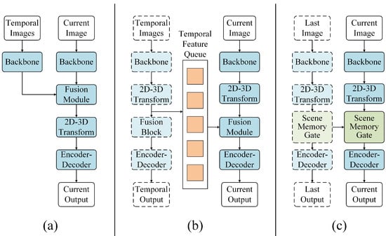 To enhance occupancy prediction performance, many methods [,,,,] have incorporated temporal image sequences. Historical images provide supplementary information, aiding the model in reconstructing the current scene, especially in occluded areas. However, integrating temporal images, particularly long-term sequences, increases computational costs for image processing and feature aggregation, thus reducing the model’s inference speed. Figure 1a illustrates a widely used method proposed by [] for temporal feature aggregation. It reuses the backbone to extract features from historical images and feeds these temporal features into a fusion module for aggregation. The fusion module typically consists of several convolutional layers. However, this approach has three main drawbacks, leading to computational inefficiency. First, the extraction of historical image features introduces redundant computation, since these image features have already been extracted at previous timestamps. Second, the temporal fusion process is redundant. For example, let T represent the current time and K represent the sequence length. At , the module aggregates features from , whereas at T, it aggregates features from , causing redundant fusion of features in the overlapping interval . Third, current temporal fusion methods risk introducing noise. These methods directly concatenate short-term and long-term temporal features with current features and aggregate them indiscriminately. While long-term features may provide valuable information about occluded areas (inaccessible to short-term observations), they often contain outdated scene information due to the ego-vehicle’s motion. Direct fusion without proper filtering may therefore propagate irrelevant or outdated information, adversely affecting model performance. GSD-Occ [] introduces a temporal feature queue to store the computed scene features, as shown in Figure 1b. When reconstructing the current scene, the model simply retrieves the adjacent historical features from the queue, avoiding redundant feature extraction [,,,]. Nevertheless, GSD-Occ’s temporal fusion still exhibits the last two drawbacks. Moreover, the size of stored features grows with the length of the temporal image sequence.