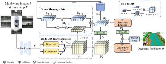 Building upon this, we adopt the dual-path architecture from GSD-Occ [], which separately processes semantic information in 2D and geometric information in 3D. The semantic path incorporates a Scene Memory Gate for efficient temporal fusion along with a lightweight 2D encoder, while the geometric path maintains GSD-Occ’s original design, which consists of a non-dilated small-kernel 3D convolution and multiple dilated small-kernel 3D convolutions. During inference, these small-kernel convolutions are re-parameterized into a large-kernel convolution to accelerate calculation. Specifically, the BEV feature map is generated by averaging ’s features along the height dimension. The Scene Memory Gate aggregates with the historical scene feature map and outputs the temporal fused features , which are then saved as the next historical scene feature map. Simultaneously, is restored to the 3D feature via the BEV-Voxel Lifting (BVL) module []. is combined with to generate . Next, the 3D geometric feature and the 2D semantic feature are further processed by 3D and 2D encoders, respectively, producing and . is then restored to 3D semantic feature via the BVL method. Finally, and are combined, and the resulting feature is processed by a prediction head to obtain the final prediction O. The dual-path architecture enables computationally and memory-efficient processing of dense, high-dimensional semantic features through its 2D pathway, while the 3D geometric path preserves crucial spatial information that compensates for height dimension loss in the semantic processing.