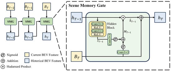 SMG first transforms the historical scene feature into a hidden state through a hidden block comprising a 3 × 3 convolution layer and a point-wise convolution layer, with each layer succeeded by a normalization and ReLU activation layer. Next, a separate 3 × 3 convolution layer followed by a sigmoid activation layer is used to predict the value score of each pixel in based on . The same module is also applied to compute the score of the current BEV feature . The mask is derived from Equation (1):
