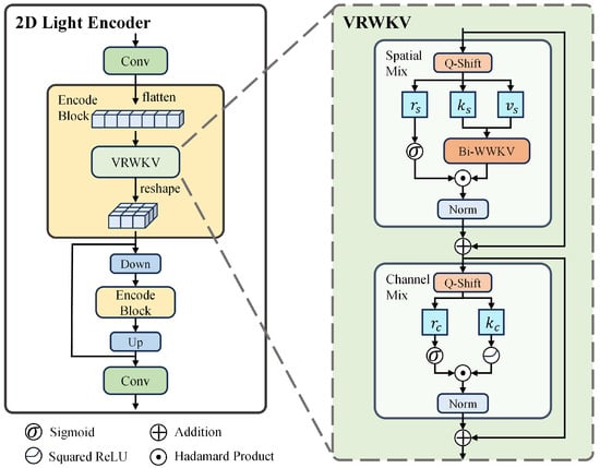 We aim to seek an encoded block structure that possesses both strong reasoning capabilities and fast inference speeds. Therefore, we employ VRWKV [] as the encoding block. The architecture of VRWKV is illustrated on the right side of Figure 4. The input is first fed into the spatial mix module. After the Q-shift operation, the input is transformed to , , and . Then, the global attention result is obtained through the bidirectional attention mechanism Bi-WKV. Bi-WKV has linear complexity and can be expressed in a summation form: