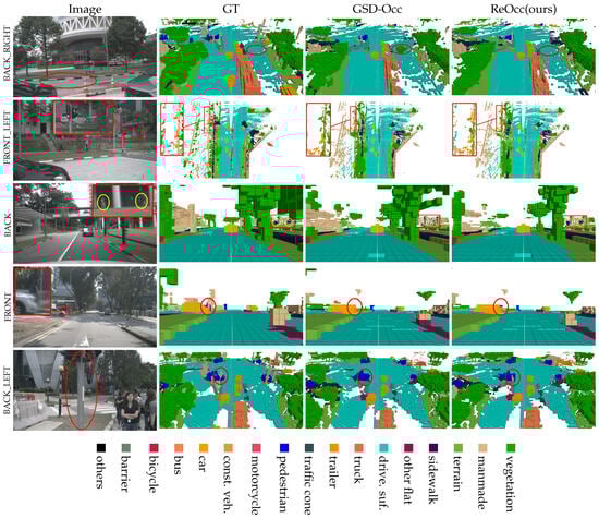 Qualitative results comparison on Occ3D-NuScenes validation set. Our proposed ReOcc is able to capture more detailed information compared with GSD-Occ. Moreover, ReOcc’s reconstruction is more stable and avoids creating nonexistent structures in the scene (row 1).