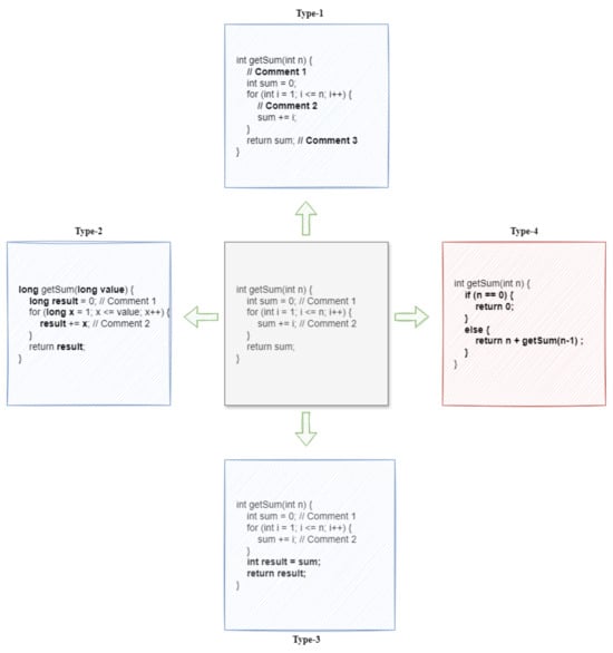In Figure 1, the original method and its T1 clone method become syntactically identical after trimming the whitespaces, layouts, and comments. After trimming and normalizing identifiers, literals, and types, the original method and its T2 clone method become syntactically identical. The actual method is syntactically like its T3 clone method after trimming and normalizing, even if a new statement is added and an existing statement is modified. The T4 clone method differs syntactically from the original method. They are very different in shape, but they all do the same computation. When focusing on the original method, for instance, it utilizes a for loop to calculate the sum value of the first “n” natural numbers, but the T4 clone method employs recursion to do the same. Hence, both are identical in semantics, functionality, and computation.