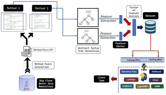 Abstract Syntax Trees (ASTs) accurately capture the syntactic structure of source code and are scalable with large amounts of code, so it makes sense to extract features using them [,]. In this study, 48 features were extracted from ASTs, including 20 features that were not considered in previous studies. Several CCD ML and DL models were developed, including LeNet-5 [] and Oreo’s Siamese architecture []. LeONet, the proposed hybrid DL approach, is introduced to learn more from the given input and to improve the CCD performance.