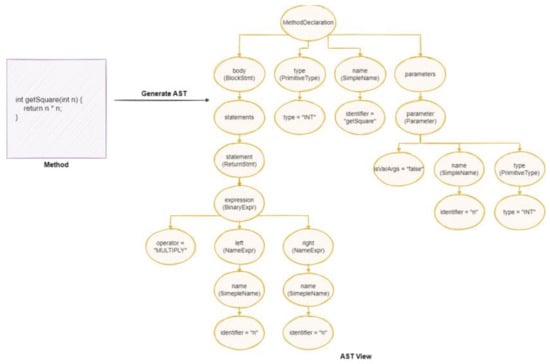 Figure 3 describes the AST view of a Java method. The “MethodDeclaration” node encapsulates all programming constructs of the “getSquare” method. When considering the “name” node, which is directly connected with the “MethodDeclarion” node, it represents a name property whose type is “SimpleName”, and it is associated with the given method’s name. Further deep down to the next level of node “identifier = ‘getSquare’”, it represents the identifier property whose simple value is “getSquare”, which is the name of the given method. Similarly, when considering the “type” node, which is directly connected with the “MethodDeclaration” node, it represents a type property whose datatype is “PrimitiveType”, and it is associated with the given method’s return type. Moving to the next level of the node “type = ‘INT’”, it represents the type property whose simple value is “INT”, which is the actual return type of the given method “getSquare”. ASTs were generated for paired methods using Eclipse JDT libraries [] and JavaParser []. After generating ASTs, features were extracted from them. In Java, the * symbol is used to represent multiplication.