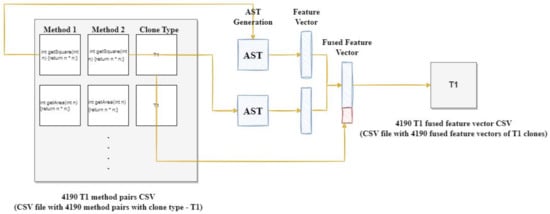 For instance, say method one and method two are considered paired methods. Once the features from method one is extracted, put them into a vector. Similarly, when extracting the features from method two, put them into a vector. Consequently, extracted features of paired methods and can be represented as feature vectors: , and . Then, the two feature vectors representing a paired method were combined into a single fused vector along with its associated clone type.