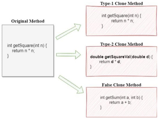Developers tend to copy and paste code when building software, either with or without alterations []. Code clone is the term for this copied or duplicated code. The practice of duplicating source code is called code cloning [,]. Software systems do not naturally experience code clones. Several variables could compel or persuade software developers to create duplicate code, for example: various reuse and programming approaches in software development strategy, such as reusing code through direct copy and paste, and generating code using tools that could result in code clones; added advantages in maintenance; limitations of developers; limitations in programming languages, such as the lack of reuse mechanisms; and duplicating by accident [].