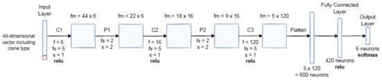 The distance dataset served as the model’s input, a 49-dimensional vector (48 features and a clone type). Then it moved into three convolutional layers (C1, C2, C3), two average pooling layers (P1, P2), a fully connected layer, and an output layer. In Figure 6, “f” represents filters, the filter size is represented by “fs”, “s” represents stride, and the size of the feature map is represented by “fm”. The model was trained for 500 epochs with a batch size of 32. Table 4 describes the parameter settings configured for LeNet-5 in this study.
