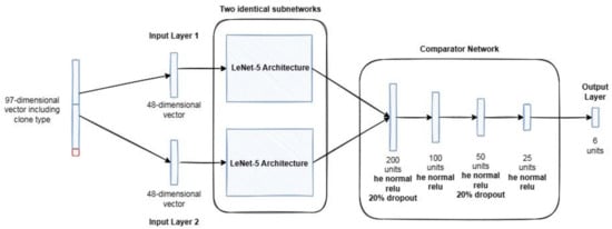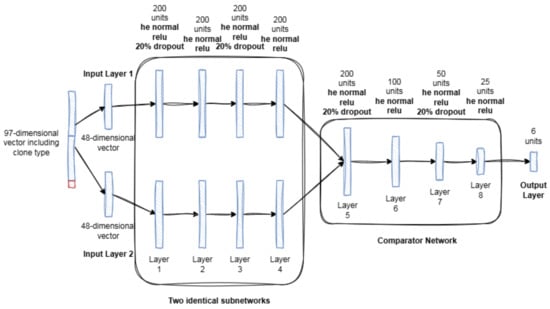 The input to this model came from the linear dataset, which consisted of a 97-dimensional vector. This vector included 48 features from each method, along with the clone type. Each subnetwork received 48 features from one method, while its identical subnetwork received 48 features from the other method. Two identical subnetworks—sister networks—mirror each other. The subnetwork had four fully connected hidden layers of 200 units. Units are the same as neurons. The comparator network then received the combined outputs of the two subnetworks. The comparator network had four fully connected layers of units 200, 100, 50, and 25. The output layer received the output of the comparator network. Six units comprise the output layer since there are six clone types. A 20% dropout was applied to every other layer in the network []. The model was trained for 500 epochs with a batch size of 32. Table 5 details the parameter settings of the subnetwork, while Table 6 outlines the parameter settings of the comparator network used in this study.