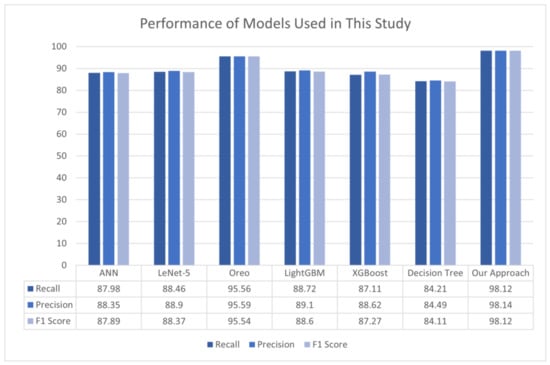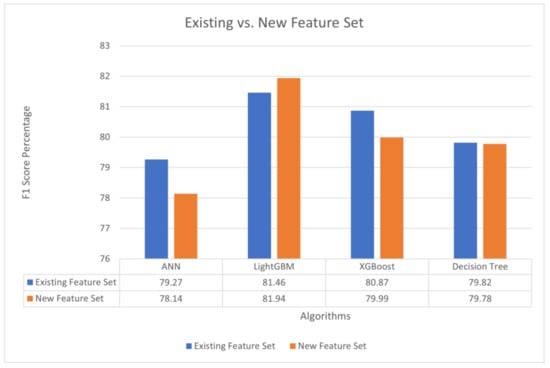 The impact of the additional 20 new features on CCD performance can be measured by analyzing how various algorithms perform on the existing feature set and the new feature set. Feature sets were evaluated using well-known models. Figure 15 illustrates the F1 score performance comparison of different algorithms between the prevailing 28 feature sets and the 20 feature sets not considered in previous studies. The results from the new feature set and the existing feature set were closely comparable, underscoring the value of the 20 features. The existing feature set helped ANN and XGBoost to have good model performance compared with the new feature set, which had slight percentage differences. In the Decision Tree, both feature set performances were similar. Interestingly, with the help of a new feature set, LightGBM performed better compared with the existing feature set.