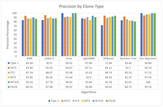 While 70% of the dataset (17,598 sets of data) was utilized for training a multiclass classification model, the remaining 30% (7542 sets of data) was preserved for testing purposes. Due to the randomness, at an instance, the test data contained 1273, 1267, 1262, 1261, 1243, and 1236 clones for types T1, VST3, ST3, MT3, WT3/4, and False, respectively. Test sets were inputted to the trained model, and its performance was evaluated using evaluation metrics. The model evaluation metrics utilized were recall, precision, and F1 score.
