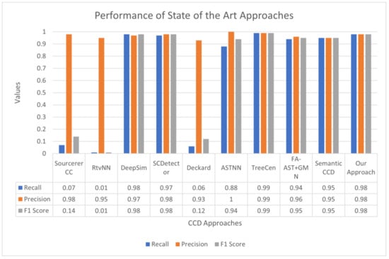 Figure 13 illustrates a performance comparison of several CCD approaches using recall, precision, and F1 score evaluation metrics. TreeCen showed top recall performance (0.99), followed by LeONet (0.98) and DeepSim (0.98). Top Precision performance was demonstrated by ASTNN (1.0), followed by TreeCen (0.99), LeONet (0.98), and SCDetector (0.98). When considering the F1 score, TreeCen expressed good performance (0.99), followed by LeONet (0.98), SCDetector (0.98), and DeepSim (0.98).