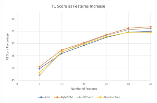 Figure 14 demonstrates the F1 score performance of different algorithms with increasing features. The feature count started at 8 and increased by increments of 8 until it reached 48. As can be seen, all four models’ F1 Scores increased as the number of features increased. This shows the significance of the features that were used in this study to detect code clones.