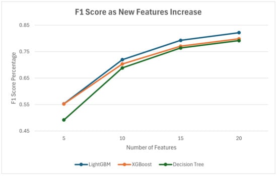 We assessed how using 5, 10, 15, and 20 of the new features affects F1 scores, as shown in Figure 16. All models show consistent performance improvement as the number of features increases from 5 to 20, with the most significant gains occurring up to 15 features. Performance improvements slow down around 20 features, indicating that including more features beyond this number provides little extra benefit.