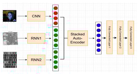 The retrieved features are combined using an SAE to provide the optimal representation of a global feature vector that will be the input for two fully connected layers for FR. The feature vectors obtained by CNNs and RNNs can have less dimensions thanks to an SAE. By doing this, we eliminate unnecessary data and retain only the most significant and practical information.