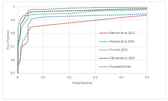55]), the best results are those that are closer to the value y = 1. This conclusion suggests that these techniques are more effective in differentiating across classes at various threshold values. When compared to other similar methods, the proposed method regularly performs better, meaning that it has a higher true positive rate for a given false positive rate. The impact of the proposed CNN architecture with three inputs for multi-processing is substantial. SAE feature fusion and selection significantly increases the accuracy of face recognition in congested conditions.