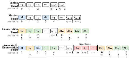 S ˜ = { [ CLS ] , t 0 , , t n 1 , [ SEP ] , a 0 , , a N 1 , [ SEP ] , M 0 s , , M | Ψ | 1 s , M 0 e , , M | Ψ | 1 e }