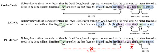 We conducted an ablation experiment specifically targeting the two-round semantic interaction. Drawing upon the outcomes of the experiment, we can directly evaluate the extent to which our devised dual semantic interaction genuinely augments the model’s performance. What should be noted is that the second-round interaction is built upon the annotated label information (that is what the first-round interaction does), so the second-round interaction ceases to exist once the label annotation information is no longer injected. However, the existence of the second-round interaction does not affect the first-round interaction. As shown in Table 4, regardless of which round of semantic interaction is eliminated, it invariably leads to adverse effects of varying magnitudes on the newly SOTA that we have developed, encompassing the precision, recall, and F1-score metrics. From the perspective of performance degradation, the detrimental effect of eliminating the second-round interaction on the basis of LAI-Net is significantly more pronounced than the impact of further removing the first round of interaction on the basis of without second-round interaction, with the discrepancy peaking at over 21-fold ( 4.67 % 4.89 % 4.67 % for RE+ in ACE05).