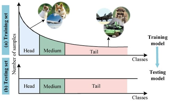 These achievements largely rely on the powerful computational resources and high-quality large-scale datasets enabled by the Internet era, such as ImageNet [] and MS COCO []. These datasets are carefully designed to ensure sufficient and balanced training samples for each category. However, real-world data distributions often deviate from this ideal scenario and instead exhibit long-tailed characteristics [], as shown in Figure 1a. In a long-tailed distribution, a small number of categories dominate the majority of the data, while a large number of tail classes contain only limited samples. This imbalanced distribution pattern is prevalent in many practical applications, such as rare object recognition in image classification and niche topic detection in text classification.