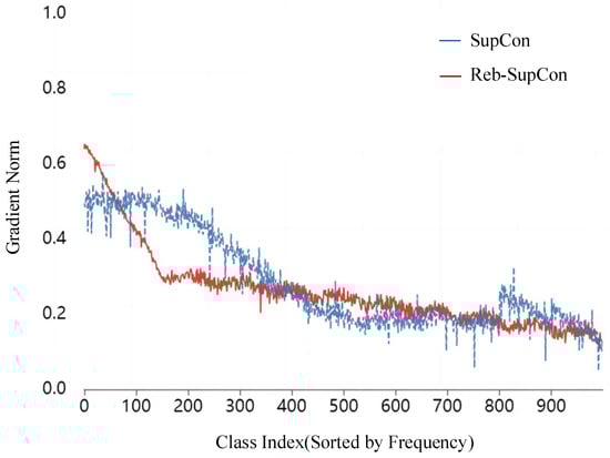 Rebalancing in Supervised Contrastive Learning (Reb-SupCon). We measured the average L2-norm of weight gradients in the final classifier layer on ImageNet-LT, with classes indexed by their image counts. While conventional SCL exhibits a steep decline in gradient norms from most to least frequent classes []—particularly showing a sharp drop for the top 200 classes—our Reb-SupCon demonstrates significantly better-balanced gradient norms across all categories.