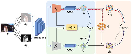To address this, we incorporate two additional terms into the original loss function: an adaptive focal gradient-weighted rebalancing factor to establish balanced feature representations, and a prototype-aware discriminative enhancement module to refine prototype representations in order to construct a more discriminative feature space. As shown in Figure 3, our framework is built on the two-branch momentum contrast (MoCo) architecture [], integrating the collaborative optimization interaction between the rebalancing module and the prototype-aware constraints. The prototype alignment dynamically adjusts the sample reweighting strategy, and the resulting balanced gradient iteratively optimizes the prototype position, forming a coupled optimization cycle.