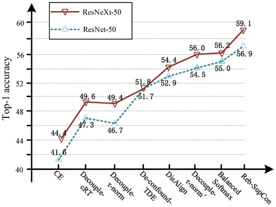 Results on ImageNet-LT. As shown in Table 4, the experimental results achieved with the large-scale dataset align with the observations from CIFAR-100-LT. Under RandAugment [] with 400-epoch training, Reb-SupCon achieves 56.9% Top-1 accuracy, still surpassing both baseline and state-of-the-art methods. Crucially, it exhibits a 1.5% accuracy gain on tail classes and a 1.0% improvement on medium classes over BS, while preserving comparable head class performance. This demonstrates that Reb-SupCon significantly mitigates the optimization suppression of tail class samples while maintaining the representational ability of head classes, achieving global balanced optimization. Additionally, as shown in Figure 4, Reb-SupCon further increases the overall accuracy to 59.1% on the ResNeXt-50 backbone network, validating the method’s generalization ability on complex backbone networks. The consistent improvements across architectures demonstrate that our core innovations—dynamic gradient awareness and prototype semantic clustering—are architecture-agnostic, universally improving feature discriminability for long-tailed data.