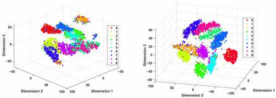 To better visualize the improvements, we employed multi-dimensional analysis methods. For gradient distributions, Figure 2 compares the average gradient magnitude distributions on ImageNet-LT before and after applying the rebalancing factor, clearly showing that our gradient balancing strategy significantly reduces the disparity between head and tail classes. For feature space analysis, Figure 5 presents t-SNE visualizations on CIFAR-100-LT, revealing deeper insights into feature distributions. The visualization experiment selected 10 representative subclasses (evenly sampled by frequency across head, medium, and tail classes) and projected their 1024-dimensional feature vectors into 3-dimensional space. Comparative analysis shows the following: (1) the baseline model exhibits obvious feature overlap at head–tail class boundaries, indicating insufficient feature learning for tail classes; (2) our method demonstrates superior feature distribution characteristics, achieving local manifold compactness through prototype clustering while maintaining global equilibrium via optimal transport planning, effectively preserving head class discriminability while recovering the underlying manifold structures of tail classes.