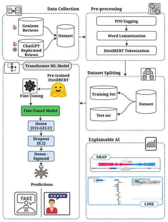 This section describes the proposed XAI-based fake review detection model designed to distinguishing between human-written and ChatGPT-rephrased reviews. As depicted in Figure 1, the proposed fake review detection approach comprises four key phases, namely data collection and preparation, pre-processing, fake review identification, and XAI.