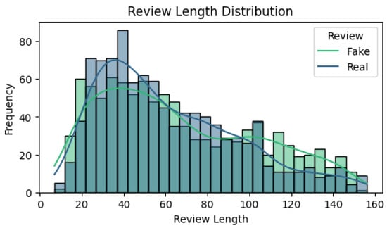 - Review Diversity: The dataset contains both human reviews and ChatGPT-rephrased reviews of varying lengths, ranging from 10 to 150 words to cover both short and long reviews. This variation captures diverse language structures, expressions, and levels of detail. Including reviews of different lengths enhances the model’s ability to generalize to real-world data. Figure 2 illustrates the distribution of review length over the dataset.
