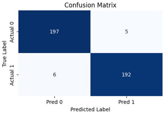 The results show that the classification accuracy of the DistilBERT model reaches 96.8% and 94.25% on the validation and test datasets, respectively. However, after applying the pre-processing phase, the accuracy increases to 98.54% and 97.25% on the validation and test datasets, respectively. To further illustrate the performance of the proposed DistilBERT classifier, a confusion matrix is shown in Figure 3.