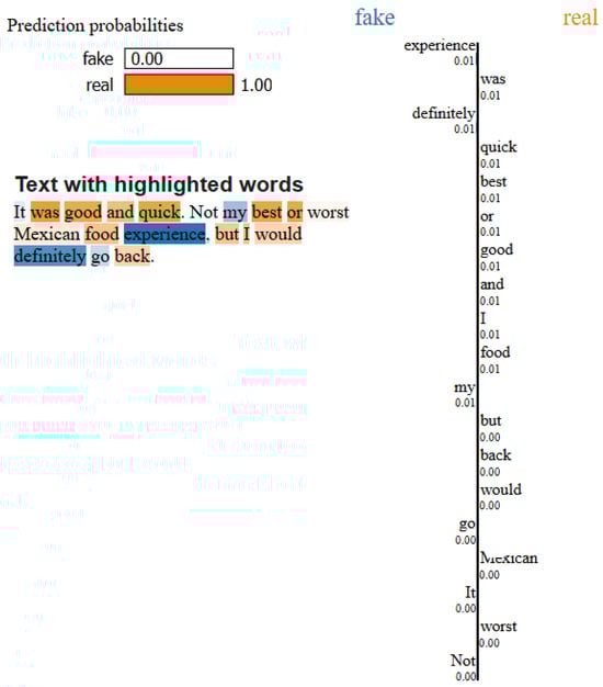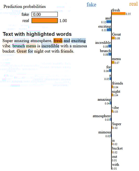 Words like “fresh”, “exciting”, and “Great” contribute significantly to the “real” classification, with scores 0.35, 0.11, and 0.08, respectively, reflecting the descriptive and enthusiastic tone commonly seen in genuine reviews. Other words such as “incredible”, “brunch”, and “menu”, with contribution scores of 0.08, 0.08, and 0.07, respectively, further strengthen the review’s context, enhancing its credibility and authenticity. These words are identified as key indicators of real reviews, shown in orange bars in Figure 4. Moreover, words like “vibe”, “friends”, and “atmosphere” have modest contributions with scores of 0.03, 0.04, and 0.03, respectively. While these words are relevant, they are likely neutral because they are commonly found in both real and fake reviews. Generic words such as “Super” and “for” contribute even less, with scores of 0.02 and 0.06, due to their widespread use in all types of text, which reduces their impact in differentiating between real and fake reviews. These words are identified as minor indicators of real reviews. Additionally, the review contains specific references such as “mimosa bucket” and “brunch menu”. Providing such concrete information in the review strengthens its authenticity. This contrasts with AI-rephrased reviews, which may be based on ambiguous or too-general praise. Thus, the LIME analysis reveals that the proposed approach is highly accurate in its prediction, strongly associating the given text with real reviews.