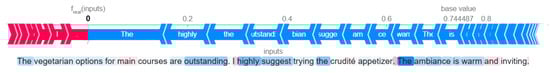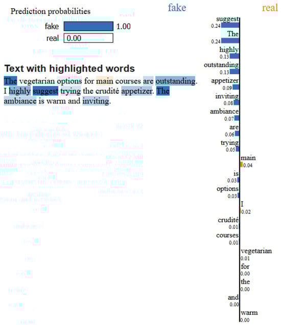 On the other hand, Figure 5 illustrates the prediction probabilities of the target fake review: “The vegetarian options for main courses are outstanding. I highly suggest trying the crudité appetizer. The ambiance is warm and inviting”, and the contribution of each individual word to different classifications.