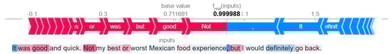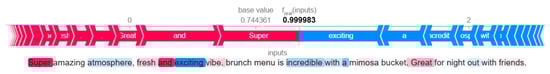 By applying SHAP to interpret model predictions, significant insights were gained into the different language features that distinguish ChatGPT-rephrased reviews from real human reviews, further strengthening the LIME findings. SHAP analysis highlighted that specific phrases and structures are commonly associated with machine-generated reviews, particularly those with a polished and formal tone. Words like “super”, “fresh”, and “vibe” were identified as strong indications of real reviews with probabilities of 0.468, 0.106, and 0.078, respectively, as shown in Figure 7.