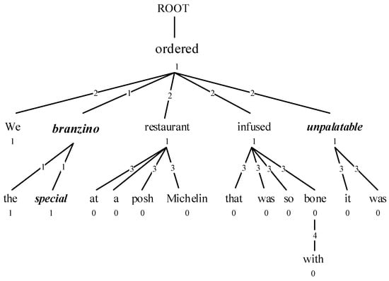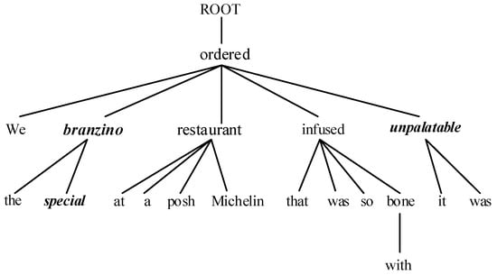 The neural network model has achieved competitive results, and distance information has been proven useful for most ABSA tasks [1,7]. However, the existing works have primarily focused on modeling the local context or the opinion span of the opinion target, which refers to the range of words that have a sentimental impact on the target, using only the literal distance between the target and the opinion words within the sentence, rather than their semantic distance. When dealing with complex and long sentences, the opinion span cannot be accurately captured. A dependency tree is a useful tool for modeling the syntactic structure of a sentence, thereby obtaining the semantic distance between words [8]. In the dependency tree, each word corresponds to a node, and two words with a dependency relationship are directly or indirectly connected. Semantic distance refers to the shortest path between nodes in the dependency tree. The paired opinion words and targets have a strong semantic relationship, which means their semantic distance in the dependency tree should be very close. Using semantic distance instead of literal distance can refine the local context of the opinion target and produce a more accurate distance measurement. For example, as shown in Figure 1, the distance between “unpalatable” and “branzino” is 16 in the sentence, but they are more closely connected in the dependency tree with a distance of 2, which provides a more concise and reasonable measurement.