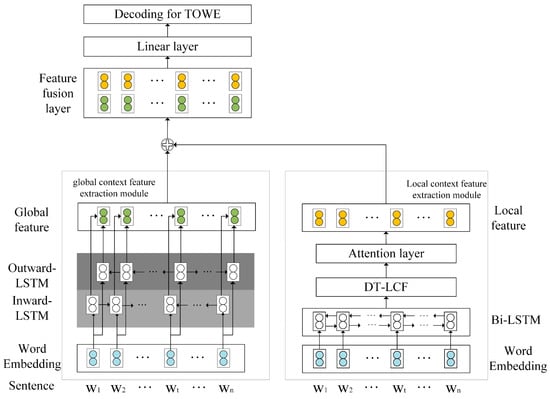 Aspect-level sentiment analysis (ABSA) [1,2,3,4,5] is a fine-grained sentiment analysis task within the Natural Language Processing (NLP) domain. It primarily encompasses sentiment classification, opinion target extraction, and opinion word extraction. Opinion targets, also known as aspect terms, are the words in a review sentence that represent entities about which users express attitudes. Opinion words are terms that clearly convey attitudes and opinions within a given sentence. Fan et al. introduced a novel ABSA sequence tagging task: target-oriented opinion words’ extraction (TOWE) [6]. In domains such as product reviews, opinion extraction fulfills critical practical needs, highlighting its urgency: consumers frequently express opinions about various aspects of a product (e.g., “The camera is amazing, but the battery life is poor”). Extracting opinion words associated with specific targets (e.g., “amazing” for “camera” and “poor” for “battery life”) allows businesses to identify strengths and weaknesses, thereby guiding product improvements.
