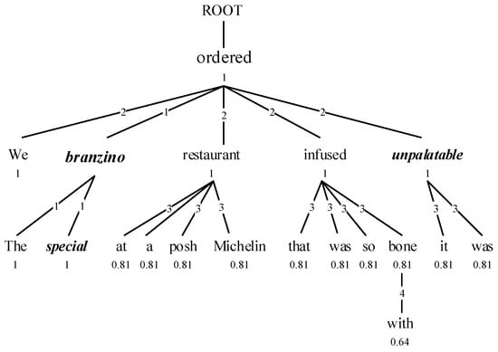 Illustration of DT-LCF-Weight. The numbers on the edges represent the distances to the target. The number beneath each word indicates its weight, which signifies its influence on the opinion target, as calculated by Formula (14). Therefore, the word “posh” is less influential to the target word “branzino” than the word “unpalatable”.