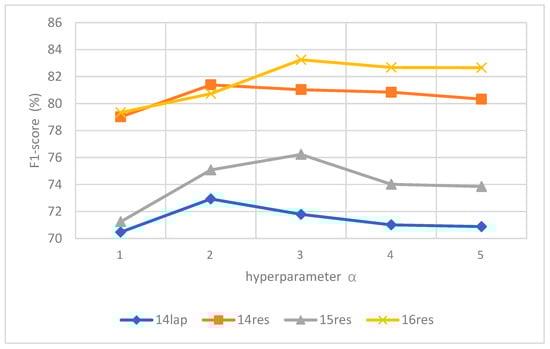 First, we conducted an experiment to analyze the impact of different α values on various data sets. We set different thresholds in DT-LCF-Mask, with α = {1,2,3,4,5}, to distinguish between local and non-local contexts. The results are presented in Figure 5.