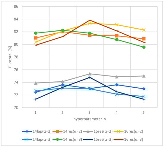 In addition to the impact of α, which is similar to that in DT-LCF-Mask, DT-LCF-Weight is also influenced by the decay rate γ. As illustrated in Figure 6, different data sets have different optimal γ values. Performance significantly decreases when γ deviates from the optimal value (for example, γ = 2 for 14lap). A smaller γ (γ = 1) fails to effectively differentiate local context; a larger γ (γ = 4) causes DT-LCF-Weight to regress to DT-LCF-Mask.