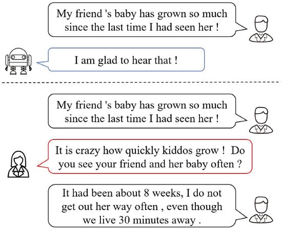 The critical components in empathetic response generation encompass the ability to perceive, comprehend, and respond to the user’s conversational state, as well as the facilitation of sustained dialogue. Recent studies have sought to cultivate empathy by integrating external knowledge such as commonsense knowledge and emotional vocabulary knowledge to augment the expression of empathy. However, two main challenges exist. (1) These methods rely on discrete sentiment words within utterances to identify and convey emotions, overlooking the continuous emotional transitions of users in context. This oversight may result in biased evaluations of users’ emotional needs. (2) Existing methods demonstrate the limited ability to understand and process semantic information, leading to the generation of less engaging responses. Consequently, human–computer dialogue lacks the sustainability observed in human-to-human interactions. As illustrated in Figure 1, the response “I am glad to hear that!” indicates that the dialogue system does not understand the user’s emotion properly, which is also not conducive to an ongoing dialogue.