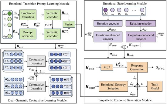 Empathetic response generation signifies the capacity of dialogue systems to comprehend and perceive a user’s circumstances and formulates appropriate responses with users as the focal point []. It has been suggested that the generation of empathetic responses has potential in areas such as counseling [] and emotional support [], particularly those that require greater user experience and satisfaction. Although most approaches endeavor to regulate emotional responses by assigning explicit emotional labels to generators [,,,], the capacity of chatbots to engage in empathetic conversations in open domains without explicit emotional labels remains a formidable challenge. Consequently, how to enable dialogue systems to autonomously generate empathetic responses remains an interesting research area.