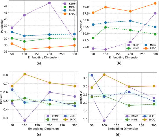This subsection provides a detailed account of our experimental implementation specifics. All models are trained in PyTorch 1.12.1, and are using the Adam optimizer [,] with and . We use pre-trained embedding GloVE vectors [] with four dimensions (i.e., 50, 100, 200, 300), where the hidden dimension is set to 300. The initial learning rate of EPDC is 0.0001, and the maximum decoding step is 30, while all the training parameters of the baseline models follow the configuration mentioned in the corresponding article. All the models are trained on one single NVIDIA GeForce RTX 3090 GPU using a batch size of 16. Early stopping is applied when training EPDC.
