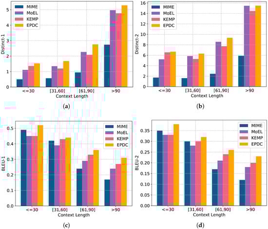 Following [,,,], we adopt four metrics to automatically evaluate the performance of EPDC and baselines, i.e., Perplexity, Distinct-1, Distinct-2 and Accuracy. Perplexity explicitly measures the model’s ability to account for the syntactic structure of both the dialogue and individual utterances []. A lower PPL indicates a more fluent sequence of words, suggesting higher quality text generation. Distinct-1 and Distinct-2 are often used to measure the diversity of generated responses by computing the ratio of distinct unigrams and bigrams, respectively. Higher values for these metrics indicate greater diversity and less generic output. Accuracy measures whether the emotion category of the response is the same as the ground truth emotion label.