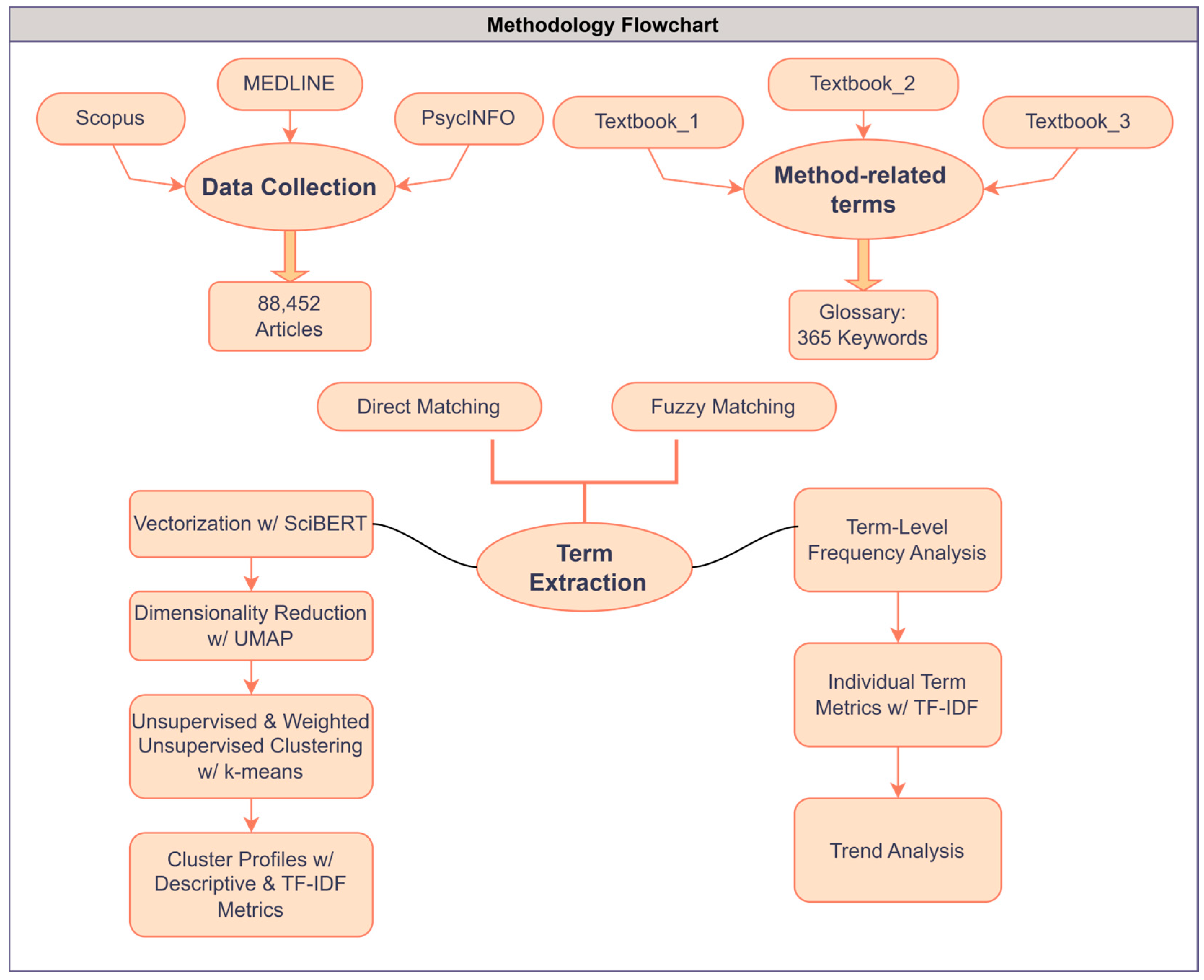 In the initial stage of the process, we collected the data and curated the glossary. Before proceeding with downstream analyses, we extracted method-related keywords from the retrieved abstracts, using both direct and fuzzy matching. These keywords were then used in two complementary analytical pipelines. In the first, the extracted keywords were vectorized using SciBERT to obtain context-aware embeddings. Dimensionality reduction was performed using UMAP, and the resulting vectors were fed into both unsupervised and semi-supervised clustering models based on k-means.