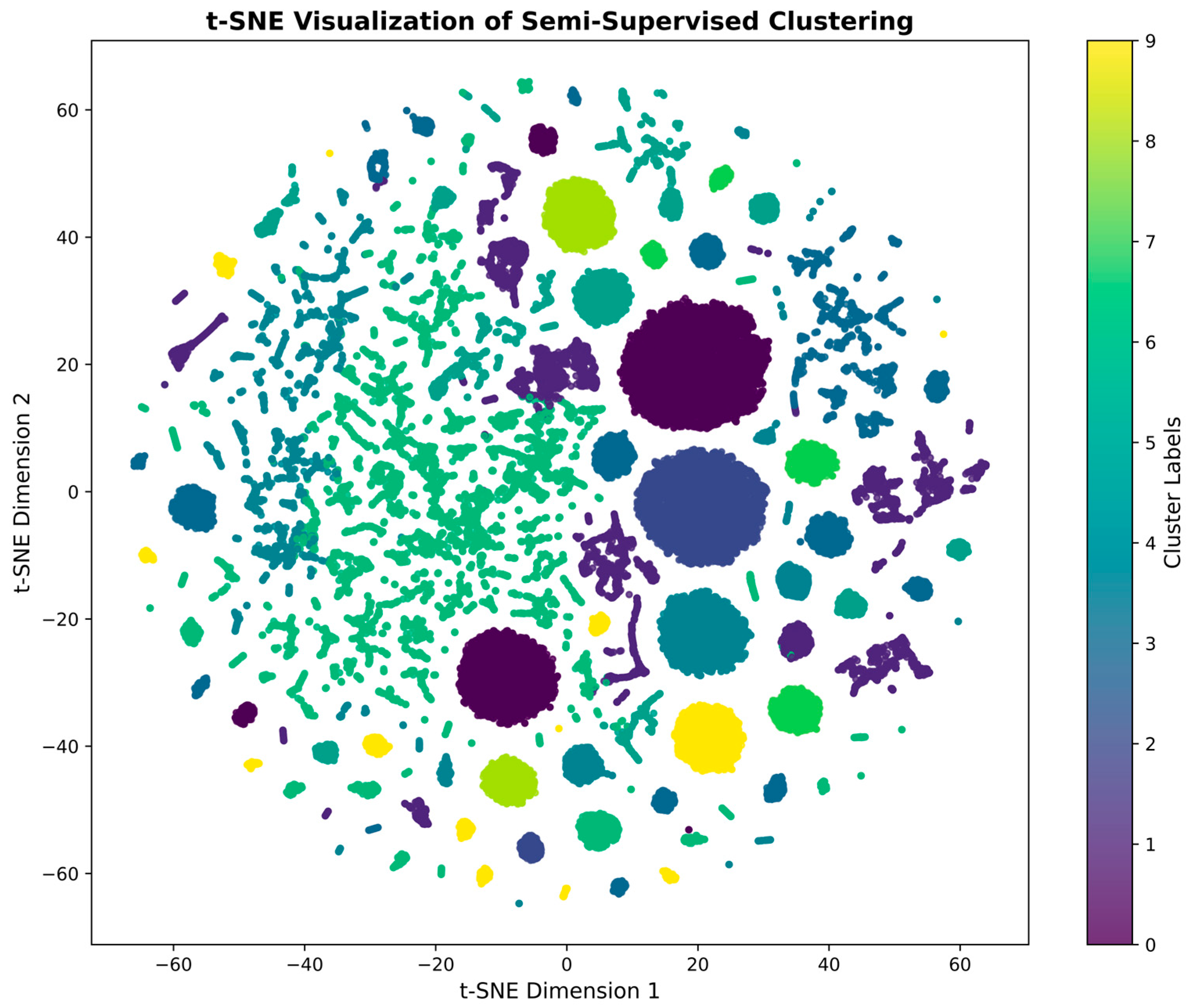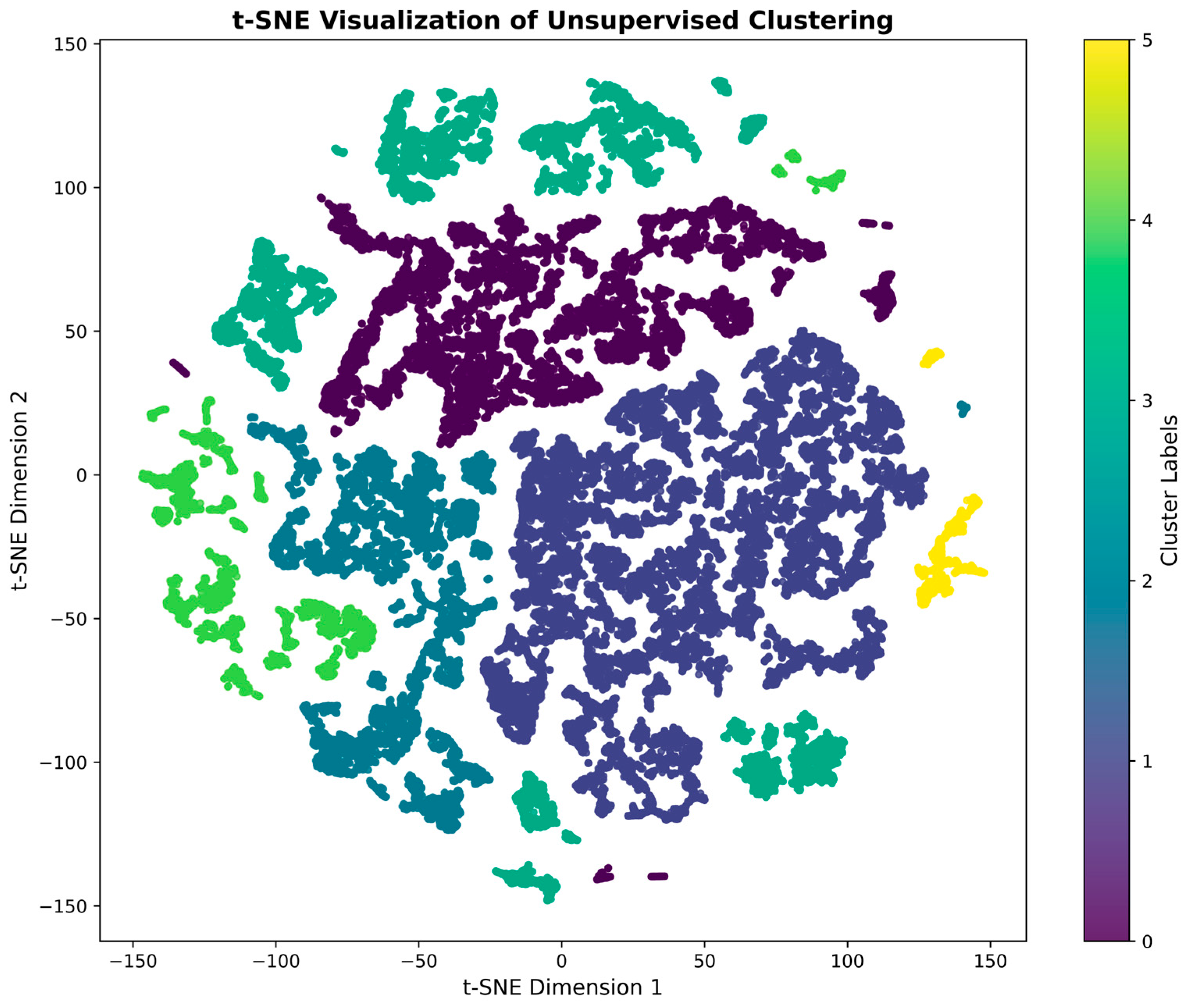 For the evaluation of clustering performance, the Silhouette score was used as a quantitative metric. Furthermore, the t-distributed Stochastic Neighbor Embedding (t-SNE) technique was employed for visual inspection of the clustering results in high-dimensional data. t-SNE includes parameters that affect visualization quality but do not influence the clustering performance itself. To optimize interpretability, t-SNE settings were tested only on the clustering models with the highest Silhouette scores.
