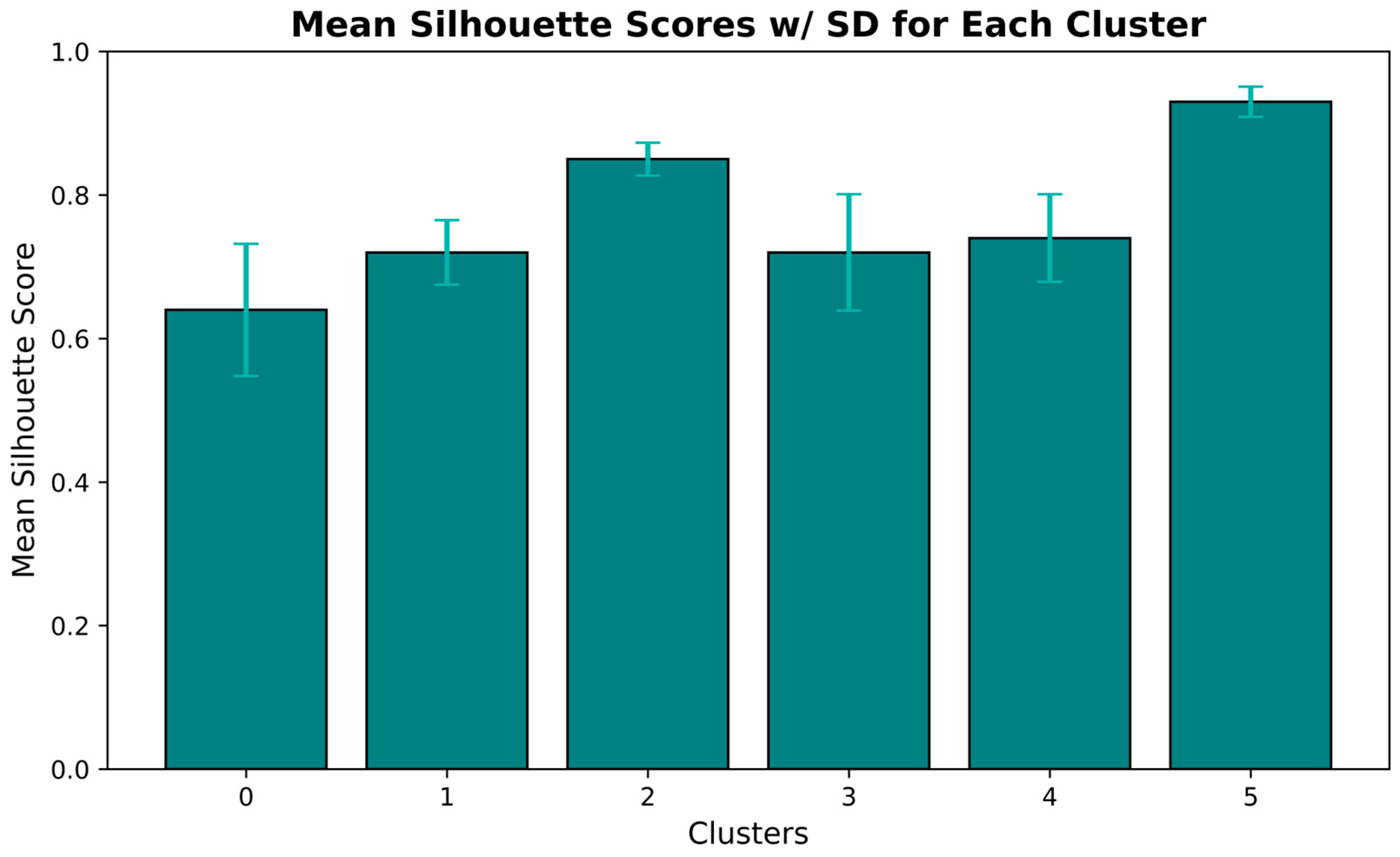 All clusters have a Silhouette score above 0.6, with cluster 0 having the lowest (0.64), and cluster 5 having the highest (0.93). Furthermore, SD, represented by the respective error bars, is low for all clusters, with cluster 0 having the highest (0.09).