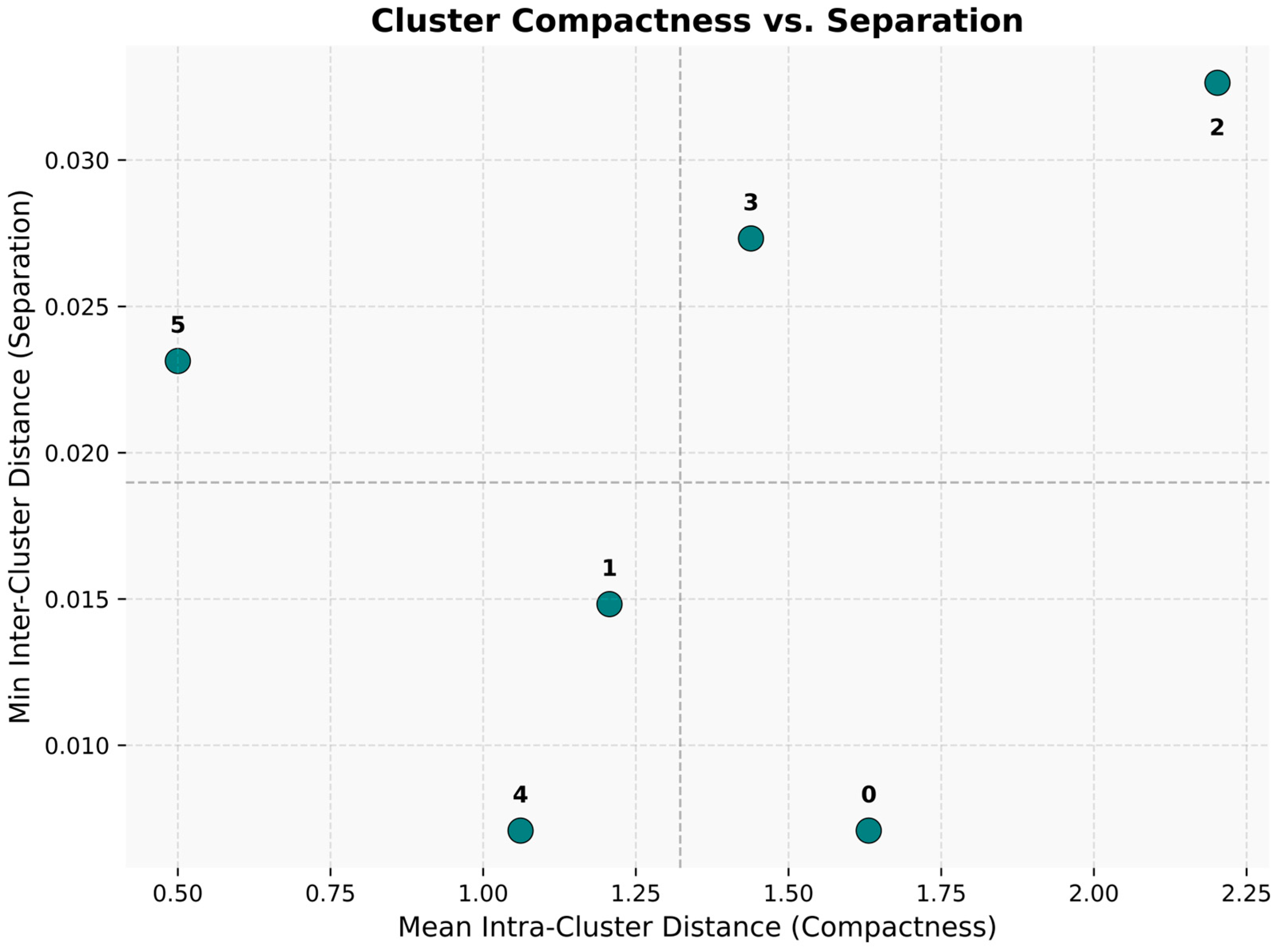 Figure 4 depicts the compactness of each cluster in relation to its separation from other clusters. Compactness is represented by the average distance of points in a cluster to their centroid, while separation is the smallest distance between the centroid of a cluster and any other cluster centroid. Higher values on the x-axis indicate that points are more loosely grouped, while higher values on the y-axis suggest that the cluster is well separated from others.