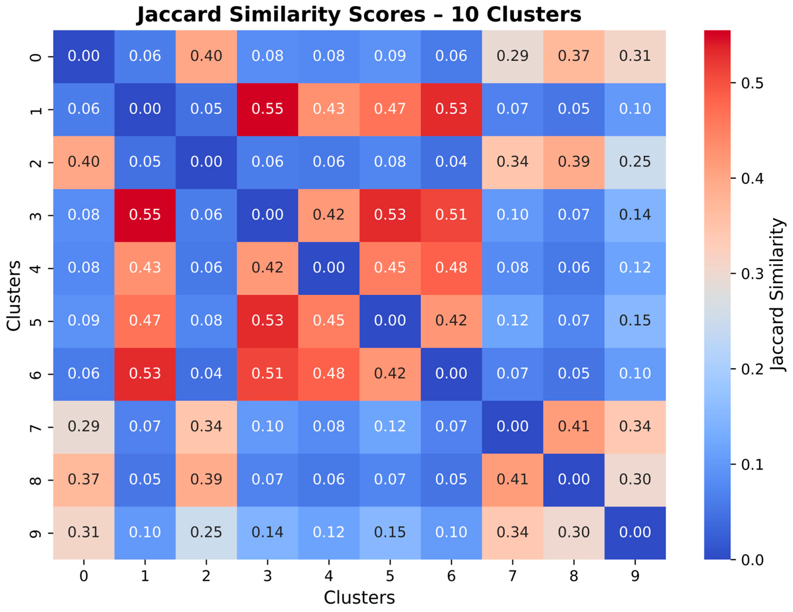 As can be observed, clusters 0, 2, 7, 8, and 9 contain just a fraction of glossary terms. In addition to this, a heatmap was generated to illustrate the overlap in keywords between clusters, using their respective Jaccard similarity scores.