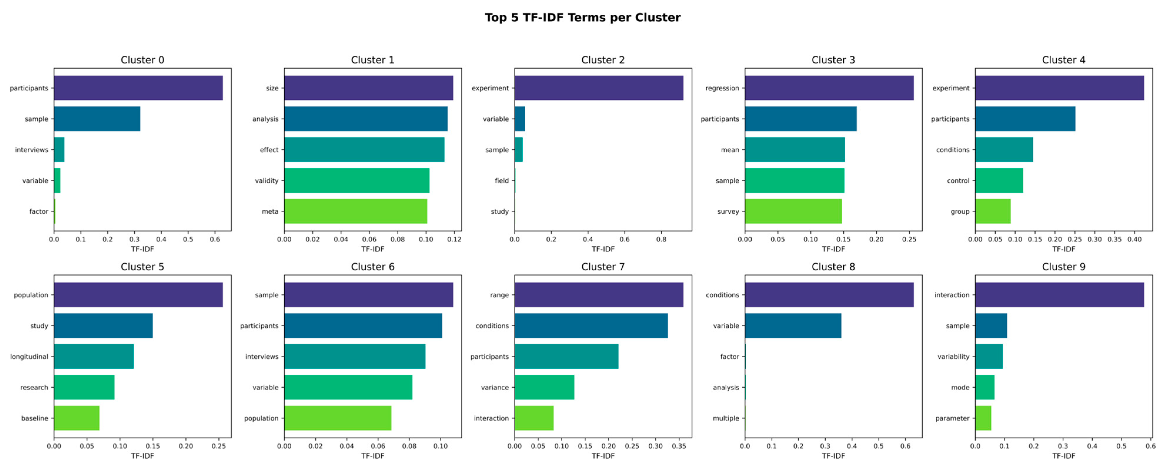 Figure 5 visualizes the terms that are shared across the top 30 terms of each cluster. Notably, “participants”, “sample”, “conditions”, “interaction”, and “variable” consistently rank among the top terms in every cluster. In support of this, a heatmap was generated to illustrate the overlap of terms among clusters, using their respective Jaccard similarity scores.