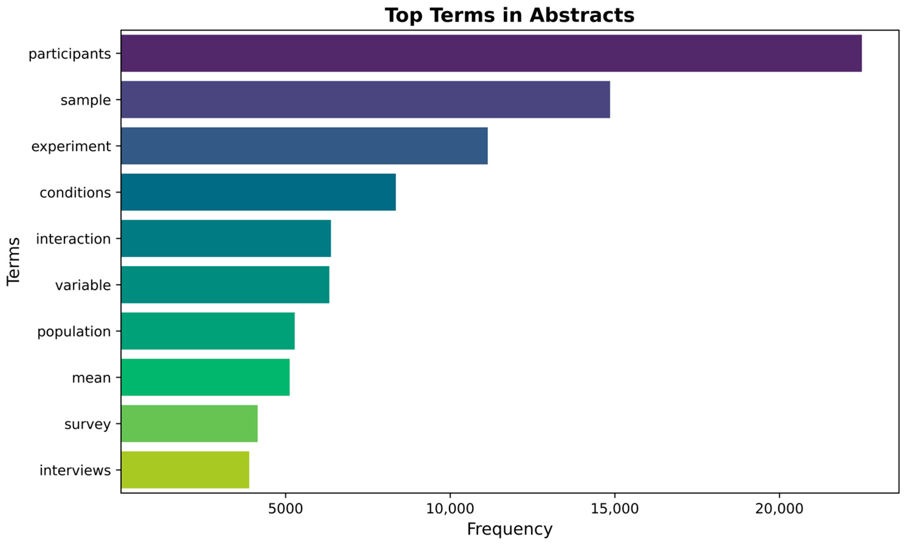 Figure 11 presents the top 10 detected terms. “Sample” and “experiment” were found in more than 10,000 abstracts, while “participants” in more than 20,000. Collectively, the top 10 terms largely reflect foundational aspects of research design and analysis, such as references to participants, variables, and commonly used procedures like surveys or interviews, that frequently appear in quantitative studies.